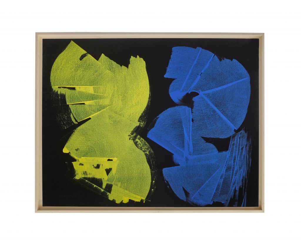 During his career, Hartung had the opportunity to work with engraving and lithography, experimenting with a variety of tools, media and processes. This led to his innovation of repurposing lithographic ink rollers. He began using ink rollers to apply acrylic on different media (canvas, isorel, cardboard) and even had his assistants make their own rollers of various sizes in order to work on all types of formats. Here, the hand moves one of the parts of the machine, giving it a new sensitivity. In these works made with ink rollers, verticality dominates. The flat painted areas stand straight or diagonally, cutting the surface into colored slices. Here too, Hartung plays with his palette. The three canvases (T1971-R12, T1975-K31, and T1976-R39) built on links between blue and yellow or orange, are perfect examples of the audacity of this period. Another example, T1976-H44, is like an urban landscape at sunset with its three vertical black bands cut on a very subtle gradient. On the other hand, in T1975-K36, the bands fragment into large juxtaposed marks, almost totemic, images of a new sign. Signs are always present in this series and they coexist with the marks of the rollers, showing that despite his technical innovations, Hartung's work is one of continuity.