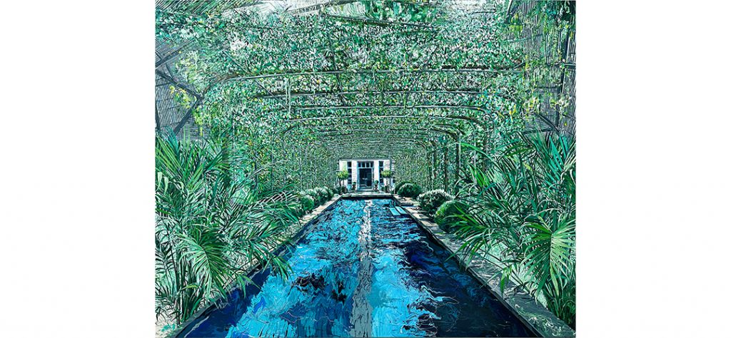 The paintings of artist Yujin KANG are based on images of surrounding spaces that have left a strong impression on her. In the past, she was attracted to and overwhelmed by the spectacular spaces of the city, often using them as subjects for her paintings. She frequently depicted spaces such as swimming pools, airports, high-rise buildings in urban areas, avenues, galleries, and museums. These spaces share the common characteristic of being artificial environments, stripped of natural elements and endowed with imposed order. Yujin KANG positively embraced these artificial spaces and actively utilized them in her work. Within these massive, capital-intensive artificial environments, her presence faded away, leaving only a sense of emptiness. She expressed this desolate landscape by pouring, splattering, and applying paint with strong brushstrokes to add expressive elements.