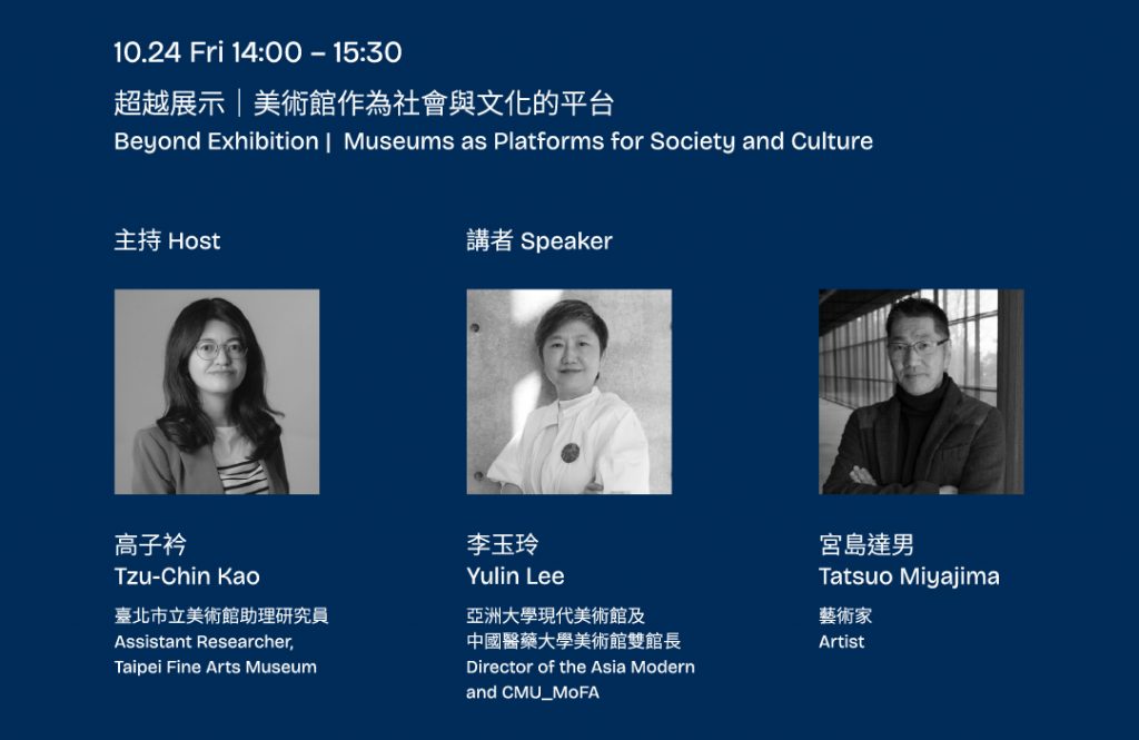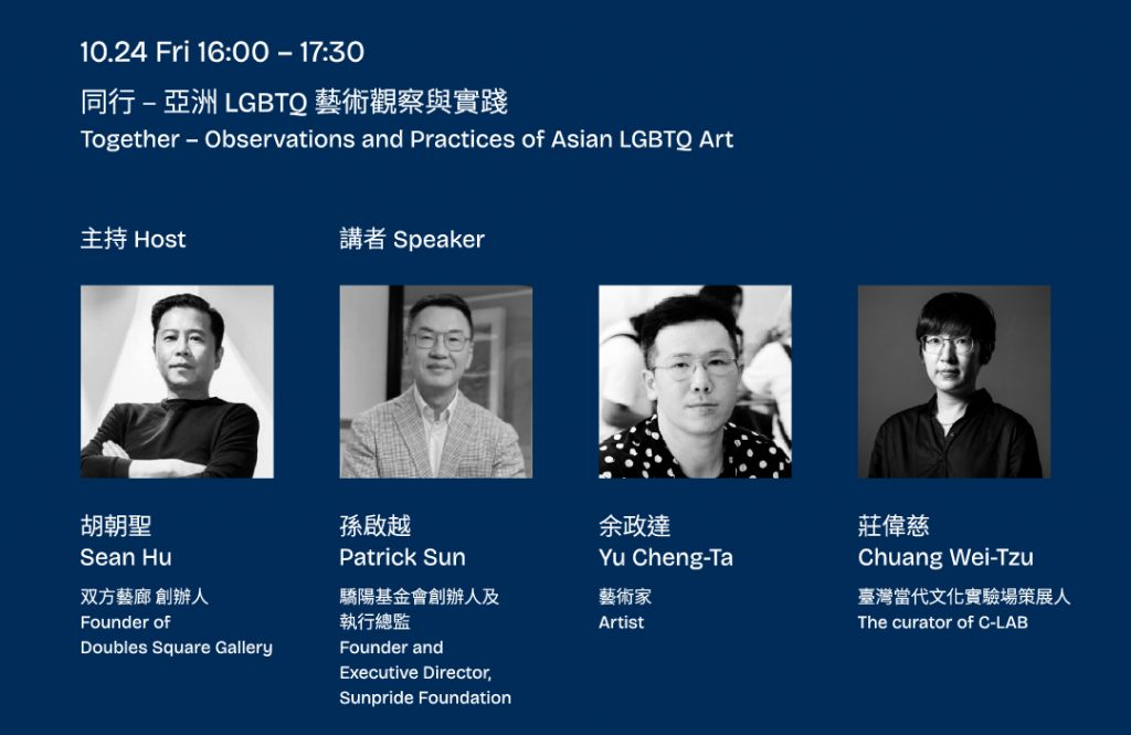 10月24日率先登場的 「超越展示|美術館作為社會與文化的平台」,由臺北市立美術館助理研究員高子衿、亞洲大學現代美術館暨中國醫藥大學美術館館長李玉玲,以及日本知名藝術家宮島達男,討論美術館在展覽之外如何成為教育與文化交流的重要場域。隨後舉行的 「同行 – 亞洲 LGBTQ 藝術觀察與實踐」,則由双方藝廊創辦人胡朝聖主持,邀請 Sunpride Foundation 創辦人孫啟越、藝術家余政達與策展人莊偉慈,共同探討亞洲 LGBTQ 藝術的發展脈絡與社會實踐。