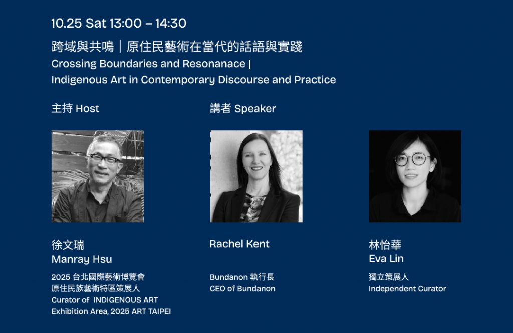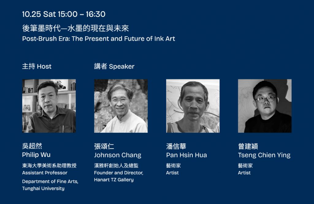 10月25日延續對話,「跨域與共鳴|原住民藝術在當代的話語與實踐」 由策展人徐文瑞主持,邀集 2025 日惹雙年展策展人林怡華 與 Bundanon 執行長 Rachel Kent,聚焦原住民藝術於當代文化的發聲與共鳴。壓軸場次 〈後筆墨時代—水墨的現在與未來 / Post-Brush Era: Discourses on the Present and Future of Ink Art〉,由策展人吳超然主持,邀請漢雅軒創辦人張頌仁、藝術家曾建穎,以及特別邀請藝術家,探討水墨如何在歷史傳統與當代實驗間持續轉化,並展望其未來的可能性。