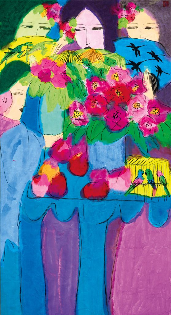 丁雄泉_拿花和扇子的女郎_壓克力_178x97cm_1985