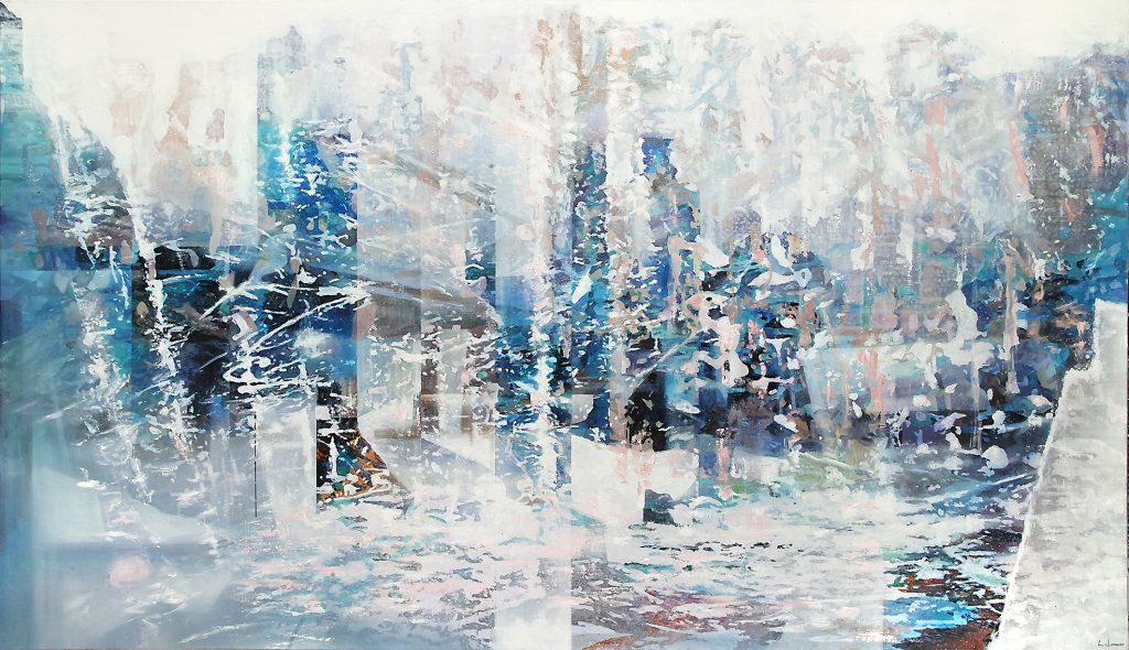 畫面以藍色和白色為主調,營造出一種朦朧、夢幻的氛圍。垂直的筆觸暗示了城市的高樓,而飄動的線條則呈現出星空的旋轉感。這種構圖既呼應了梵谷原作中的旋渦狀天空,又融入了現代都市的複雜幾何。