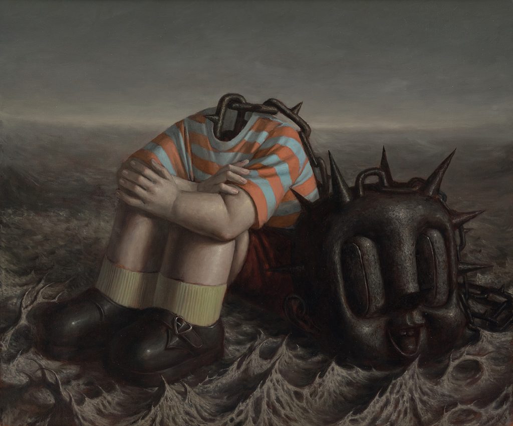 This piece reflects a state of emotional exhaustion and inertia. With a dreamlike figure suspended in stillness, the work captures the quiet weight of being stuck within one’s own inner world.